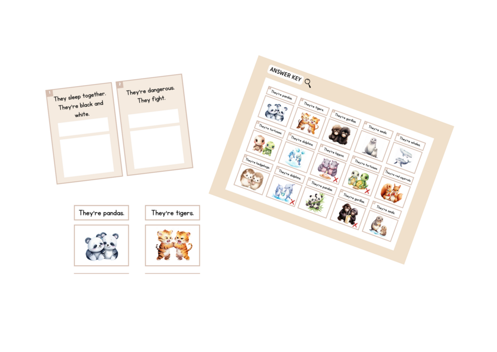 • TARJETAS DE LECTURA Y EMPAREJAMIENTO: 15 tarjetas de descripción relacionadas con el vocabulario de animales en peligro de extinción donde los estudiantes deben emparejar la oración y la imagen con la tarjeta. Las tarjetas están formuladas en el tiempo presente simple.