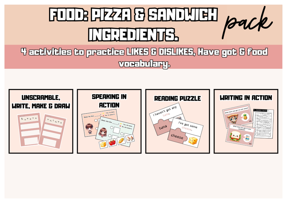 Writing in Action: A writing and speaking exercise focused on food vocabulary, where students describe the ingredients of a pizza or sandwich, using cards and worksheets to enhance accuracy and self-assessment.