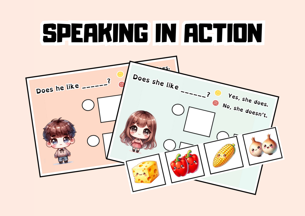Speaking in Action: A set of 6 communicative cards and 3 reusable food templates for practicing expressions of likes and dislikes about food, where students draw emojis to indicate their preferences.