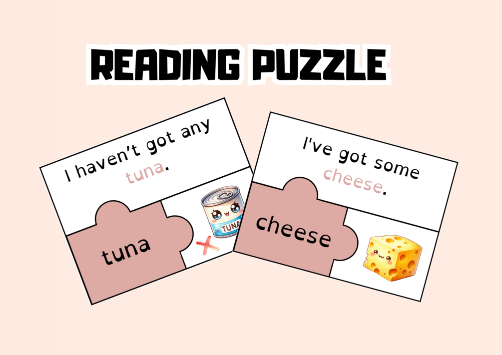 Reading Puzzle: A reading puzzle with 28 puzzles divided into three pieces that combine colour-coded sentences, food-related vocabulary, and images, promoting the fun and educational association of words and images.