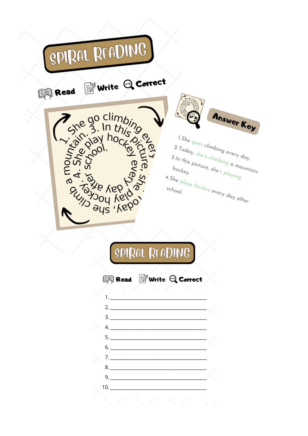 - SPIRAL READING Present Simple & Continuous. Sports Edition: 6 self-correcting spiral readings containing present simple and present continuous sentences with errors related to sports vocabulary, which students will need to find and rewrite correctly.