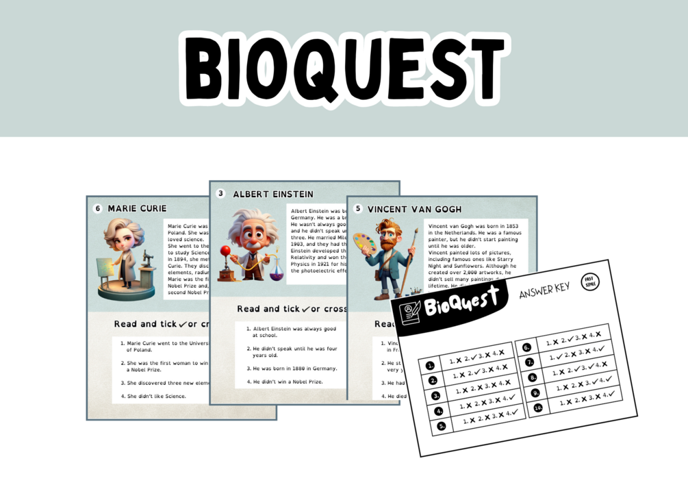 • Activities: Students read the biographies and evaluate 4 true/false statements on each card to test their comprehension. They use the ANSWER KEY to check their answers.