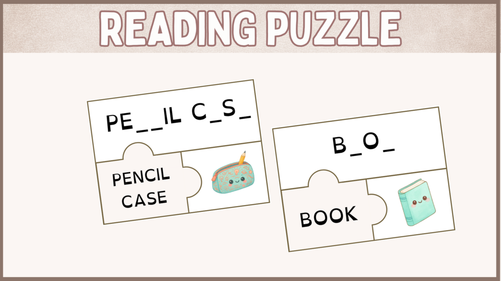 - Reading Puzzle: Emparejar imágenes, palabras y huecos en blanco para reforzar vocabulario.