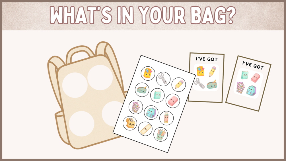 - What’s in Your Bag?: A memory and speaking game where students collect objects to complete their backpack.