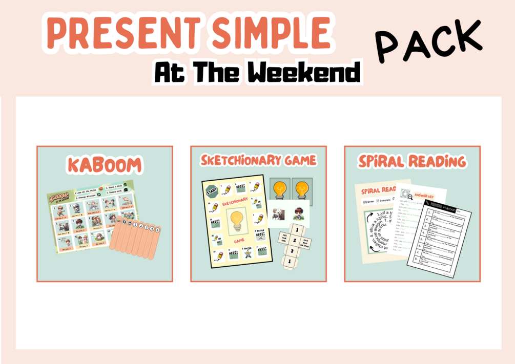 - Kaboom Game: A board game where students create sentences related to weekend activities.