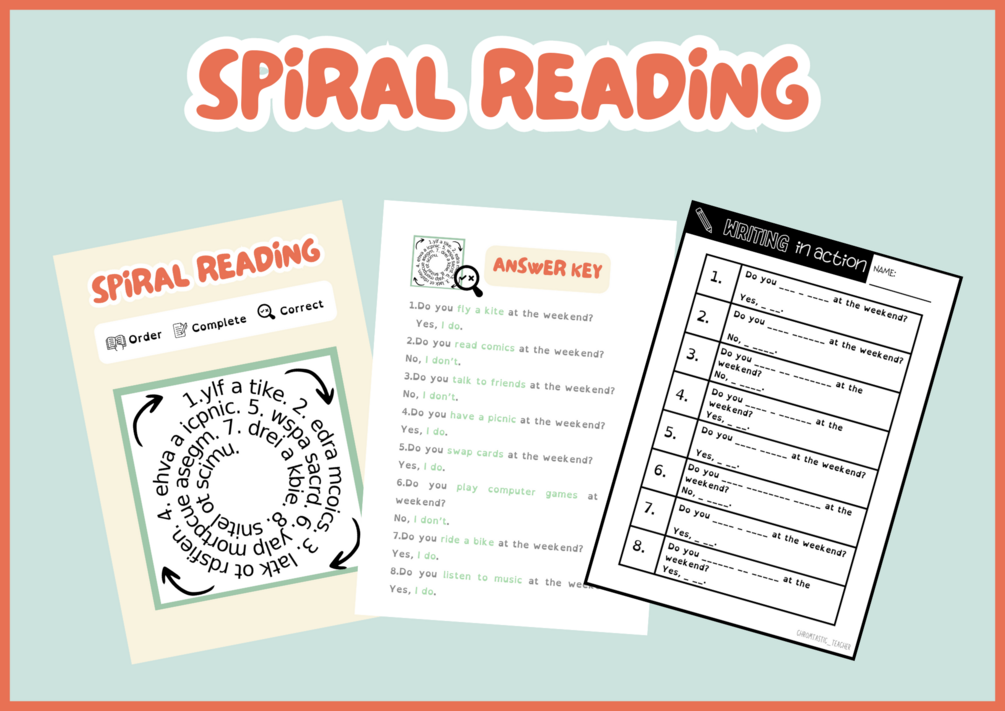 - Spiral Reading Station: Includes 2 Spiral Reading Cards with deliberate mistakes for students to correct and 2 Writing in Action Sheets for sentence completion.