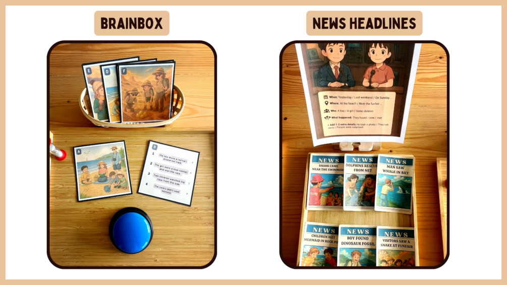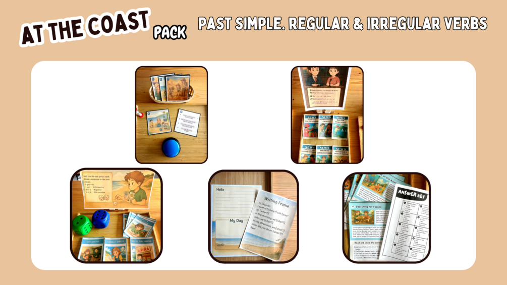 📚 Past Simple Grammar Stations – Coastal-Themed ESL Pack A fun and engaging printable resource to practise the past simple tense, with a special focus on irregular verbs in affirmative, negative and WH-question forms. This pack includes 5 hands-on learning stations for ESL or EFL students (ages 9–12): reading comprehension, speaking with dice, true/false visual cards, guided writing (postcard), and creative storytelling using news headlines. Perfect for upper primary or lower secondary students learning English as a second language. Ideal for grammar workshops, stations, rotations, or project-based learning. Includes full instructions and answer keys.