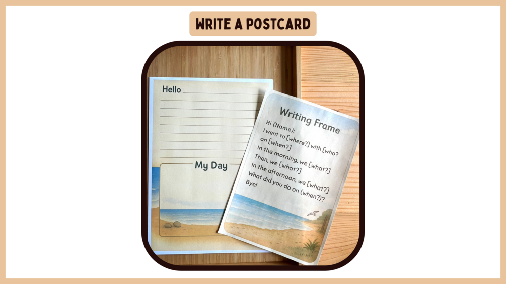Postcard writing template + guided prompts to help students describe a day at the coast using the past simple tense.