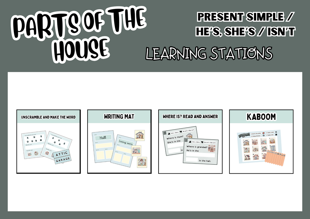 This document includes four engaging learning stations designed to help students practise vocabulary related to parts of the house and the use of the present simple tense with "is" and "isn't." Each station is designed to reinforce different aspects of language learning.