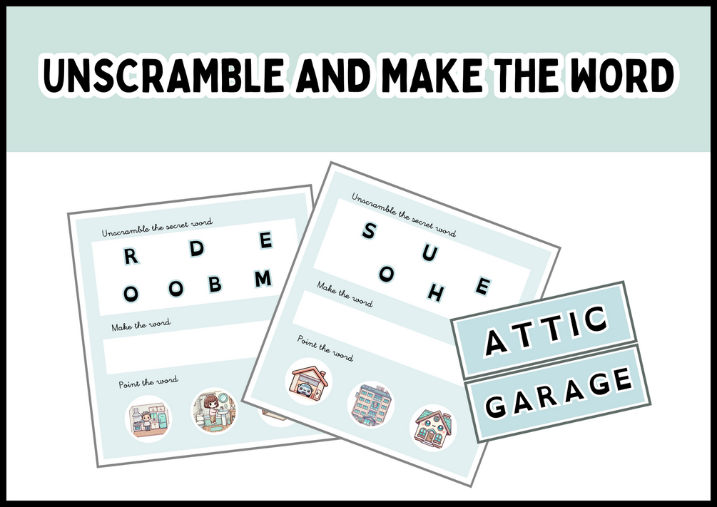 - Incluye: 12 plantillas de actividad con palabras desordenadas, secciones para construir las palabras con letras manipulativas y una sección con tres opciones para seleccionar la palabra correcta usando una pequeña pinza. También incluye 12 tarjetas de vocabulario para apoyo adicional.