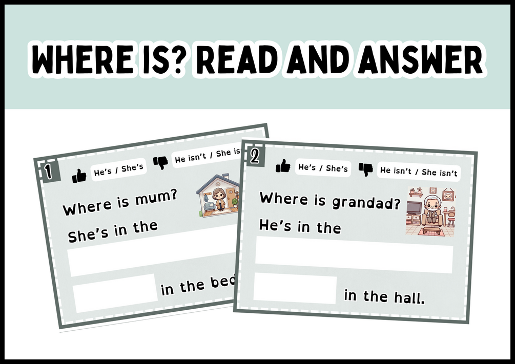 - Summary: Students answer questions about where someone is in the house using "is/isn't," and then write a negative sentence about where they are not.